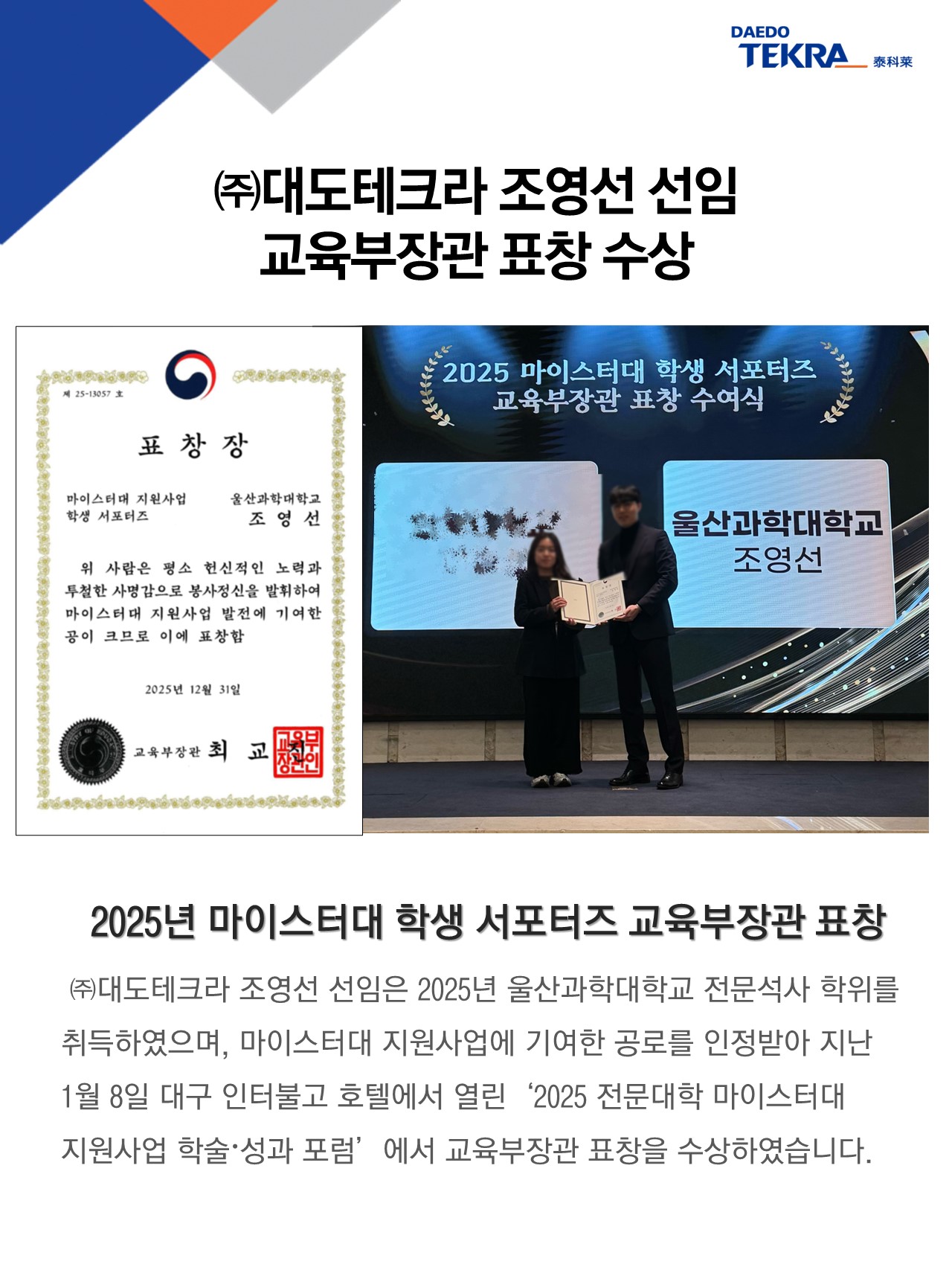 (주)대도테크라 조영선 선임 교육부장관 표창 26-01-26 18:58