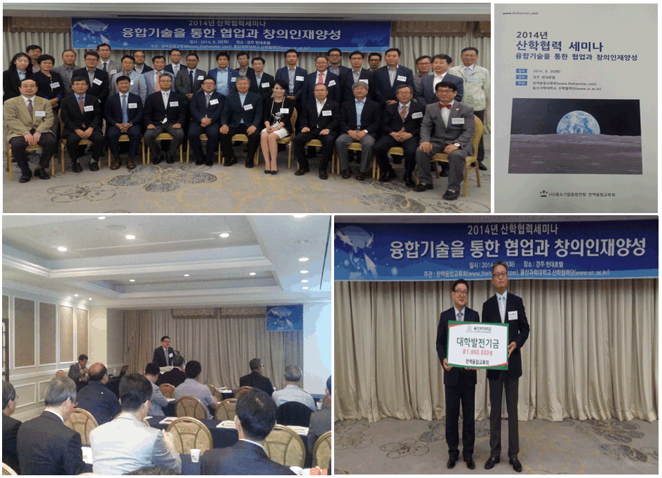 2014년 산학협력 세미나 " 융합기술을 통한 협업과 창의 인재 양성" 일시 : 2014.09.30 (화) 장소 : 경주 현대호텔 주관 : 한맥융합교류회(www.thehanmac.com) 울산과학대학교 산학협력단(www.uc.ac.kr)