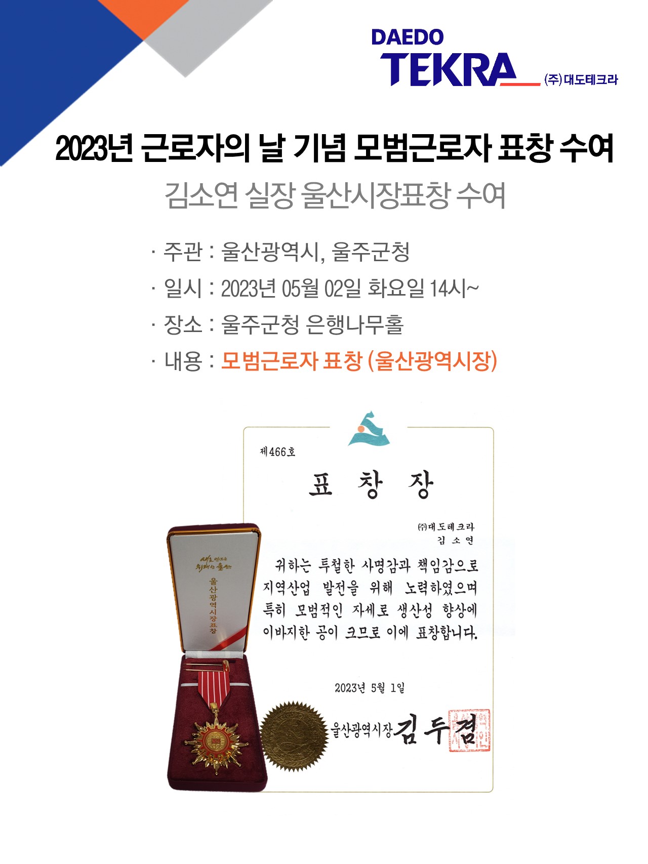 2023년 근로자의 날 기념 '모범근로자표창' 수여(김소연 실장) 23-05-03 10:03