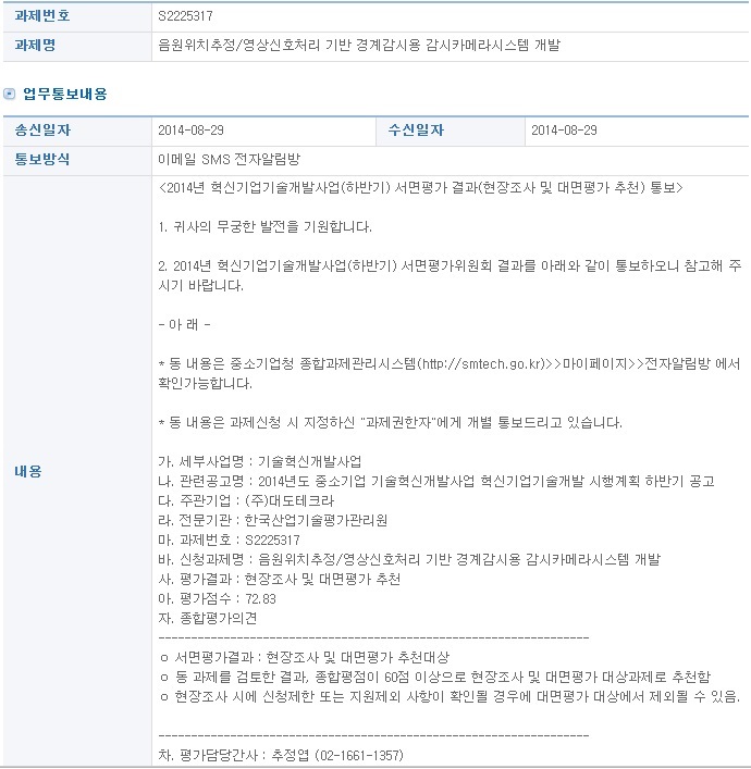 2014년 하반기 기술혁신개발과제를 제출했는데 1차 서류심사는 통과했습니다